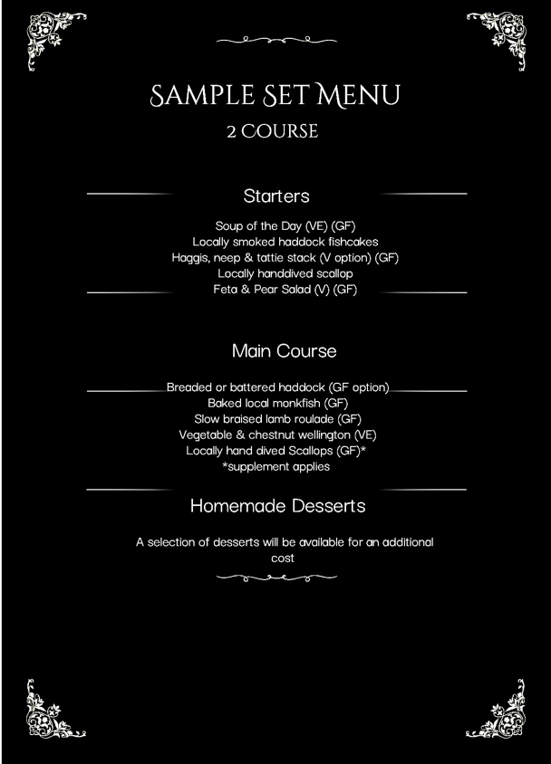 We have introduced a Dinner/Bed and Breakfast rate which includes a 2 course set menu. Dessert course is available separately or can be replaced for a starter.